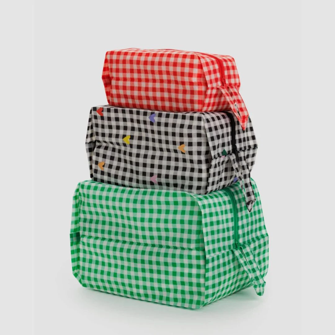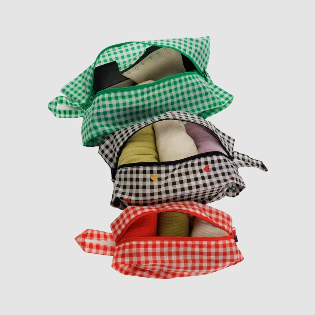 A set of three zippered pouches for travel and organization, with loops for carrying and hanging on the go. Perfect for packing, organizing your bag, or home tidying.
