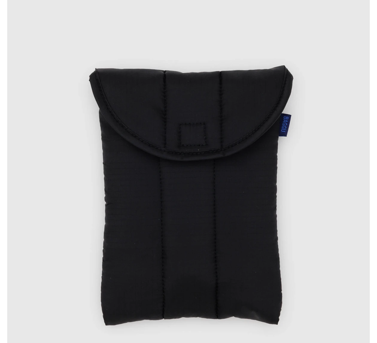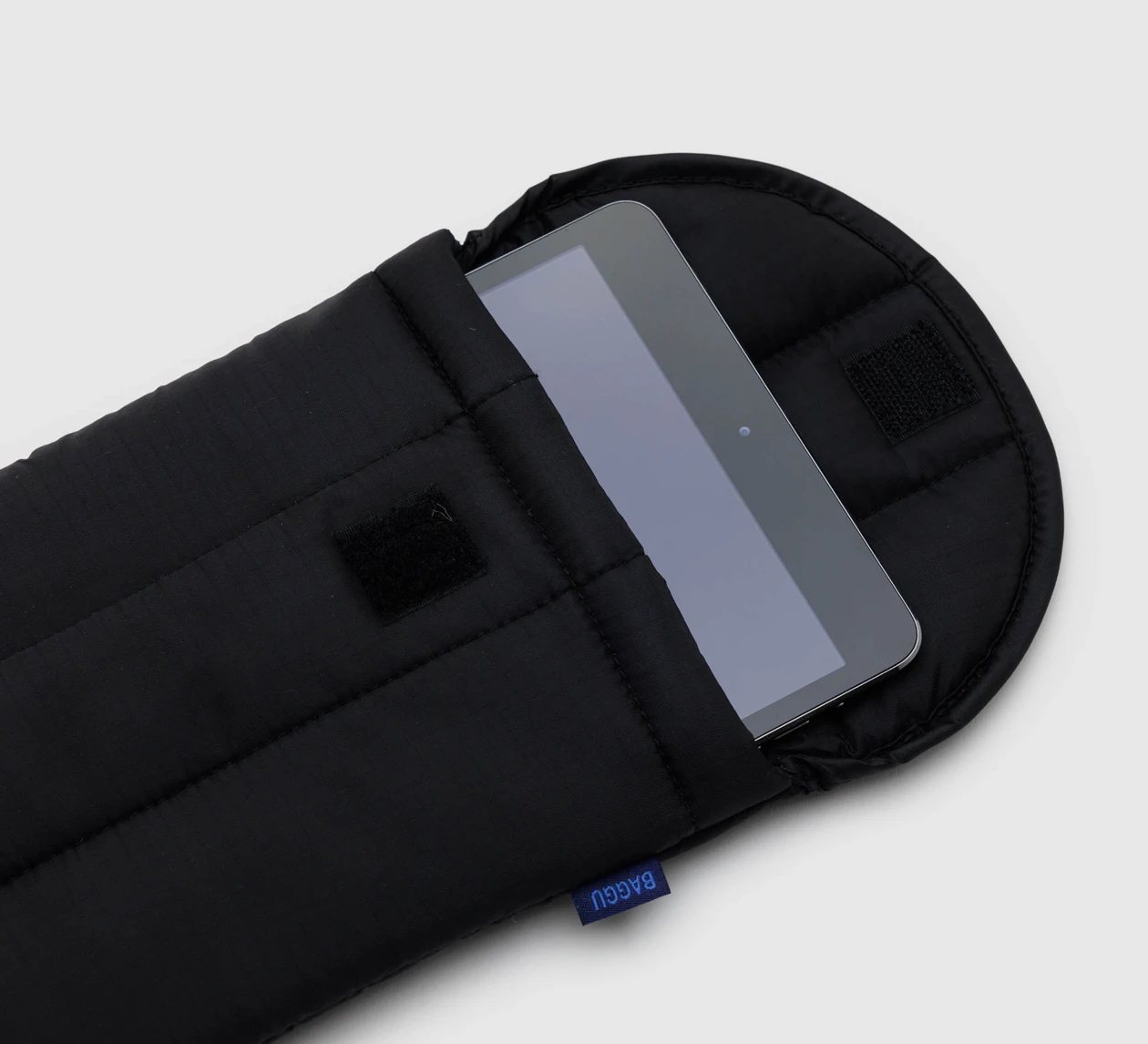 Baggu’s quilted case for a tablet. Lightly padded to cushion your items from getting scratched or dirty. Complete with a velcro flap closure. Available in black.