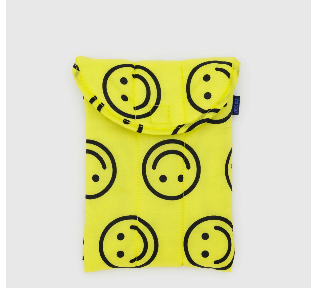 Baggu’s quilted case for a tablet. Lightly padded to cushion your items from getting scratched or dirty. Complete with a velcro flap closure. Available in the yellow happy print.