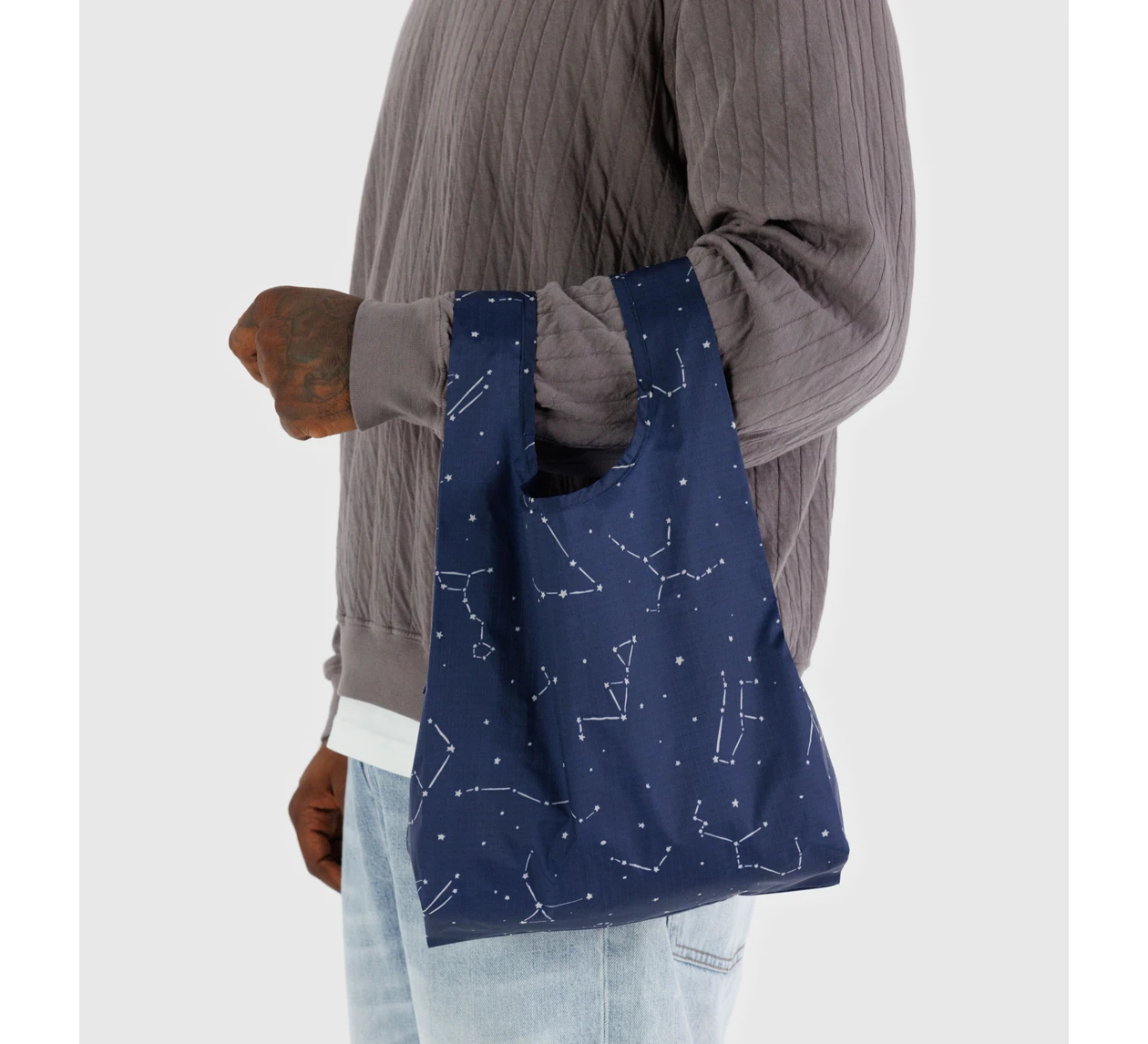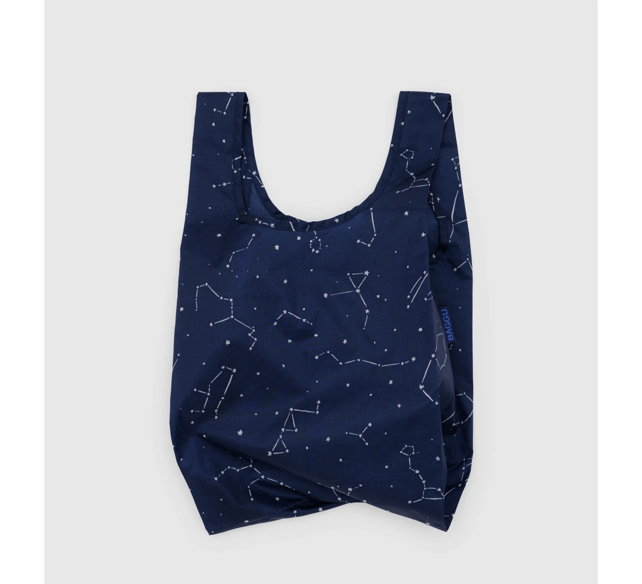 Available in Midnight Constellation, the Baby is a smaller version of Baggu’s best selling reusable shopping bag. Perfect for your lunch, a six pack, extra shoes, or a trip to the corner market. Folds into a flat 4 in. H x 4 in. W pouch. Holds 30 lbs.