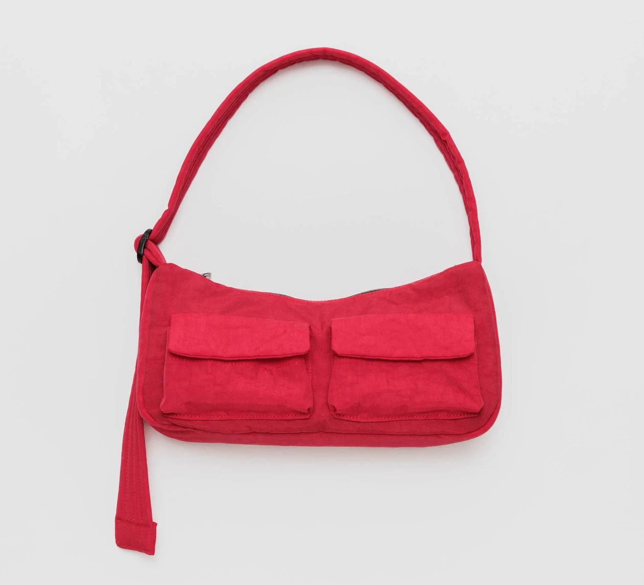 An all new design from Baggu! The Cargo Shoulder Bag is a riff on the Baguette style bag featuring two exterior pockets with a magnetic snap closure and an adjustable strap. Available in Candy Apple.