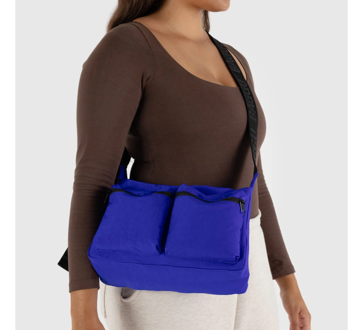An all new design from Baggu! The Medium Cargo Shoulder Bag is a perfect daily carry-all with a zip closure and two exterior pockets and an interior pocket. Available in Lapis.