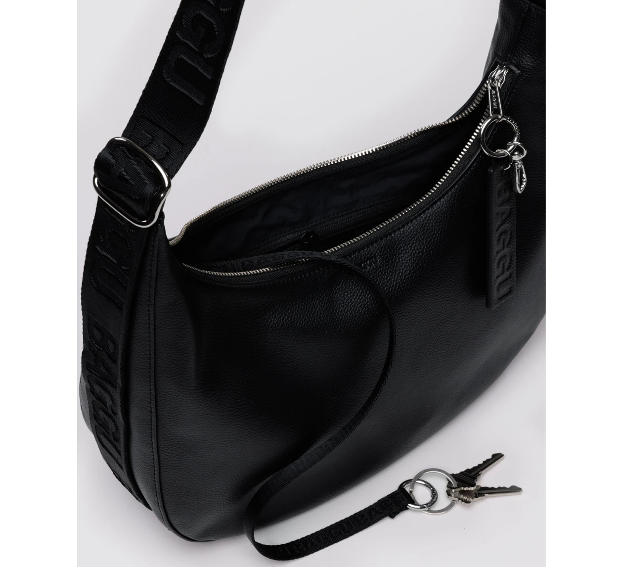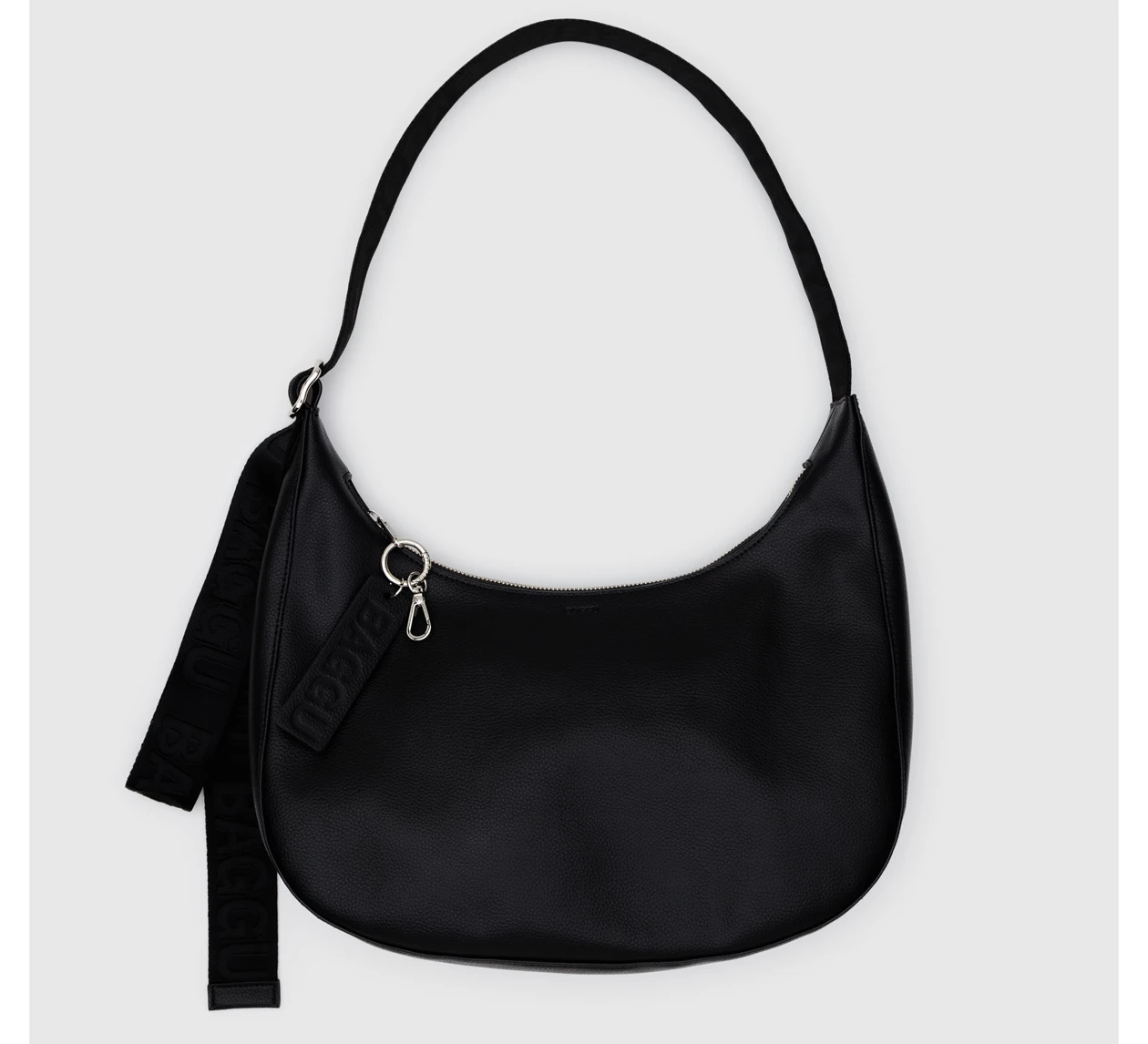 The Medium Crescent bag the a shoulder bag that works crossbody too. Featuring adjustable strap and two interior pockets with a zip closure. The bag is available in Baggu’s new black leather.