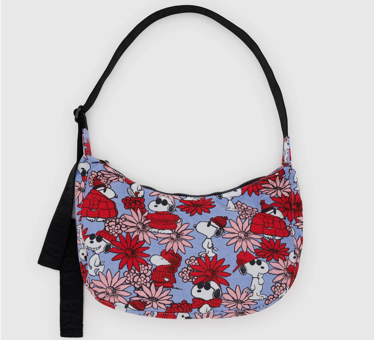 The Medium Crescent bag the a shoulder bag that works crossbody too. Featuring adjustable strap and two interior pockets with a zip closure. The bag is available in Floral Snoopy.