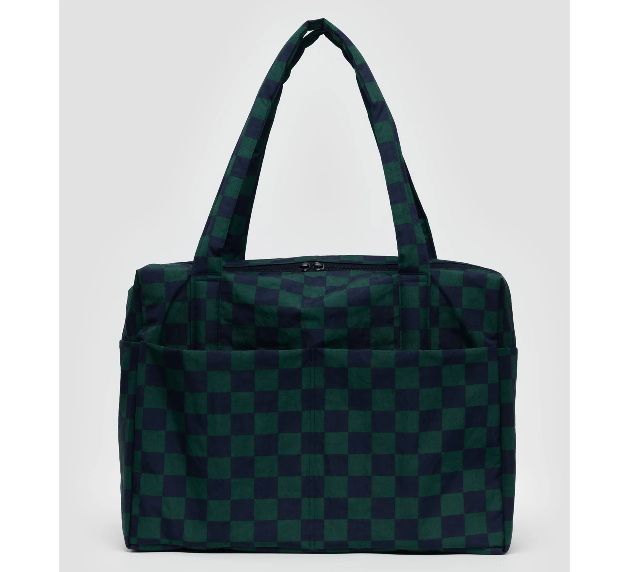 The Carry-On Cloud Bag is the largest version of Baggu’s new style. It’s super-light but made from durable heavyweight nylon, making it easy to wash. Straps fit comfortably over the shoulder. Details include a top zip closure and padded straps plus it packs down into its detachable interior pocket. Updates include a trolley sleeve and two exterior pockets. Available in Navy Green Check.