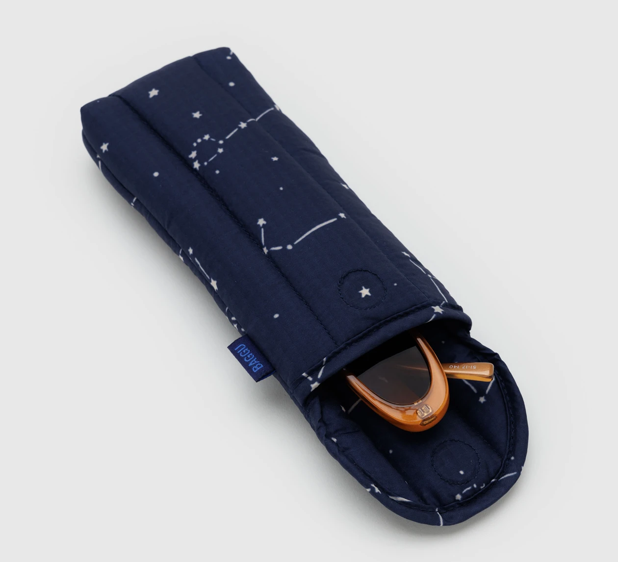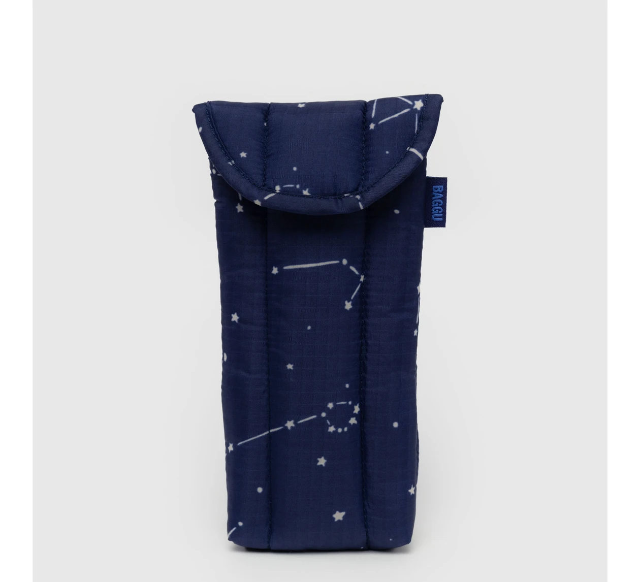Baggu’s quilted case for glasses are lightly padded to cushion your items from getting scratched or dirty. Complete with a velcro flap closure. Available in Midnight Constellation.