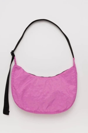 Stay organized wherever you go with the medium nylon crescent bag. This unique bag can be worn slung over your shoulder or crossbody for a modern messenger bag feel. Its sturdy nylon build and spacious interior make it the perfect choice for any occasion.