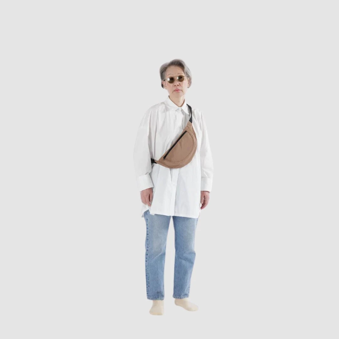 A streamlined heavyweight nylon crossbody with a sling shape that hugs the body. Wear across your body, over your shoulder or around your waist
