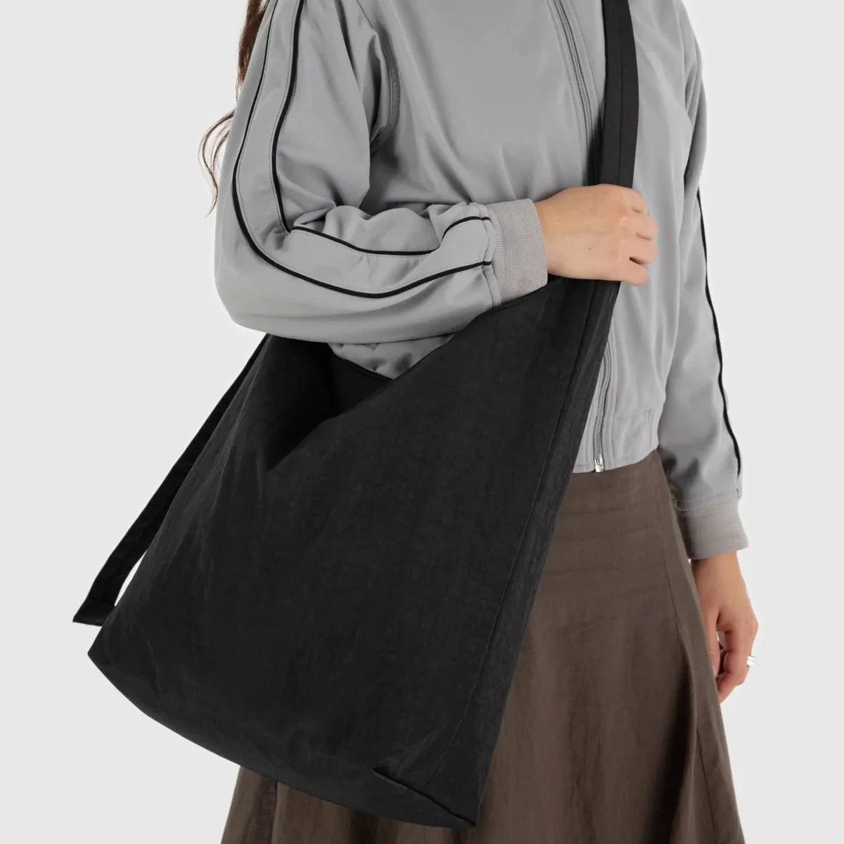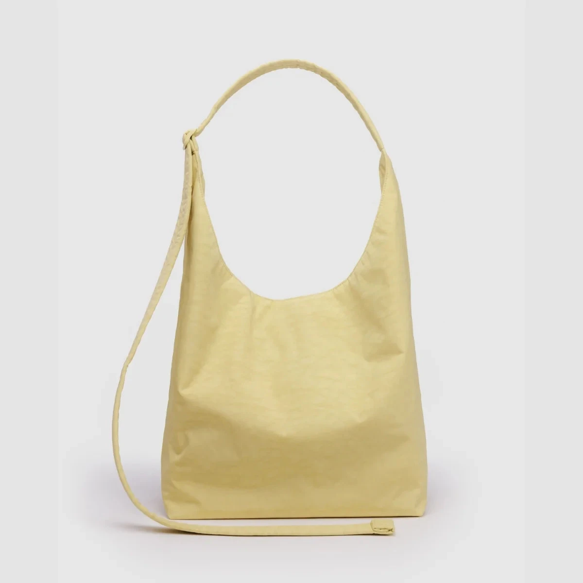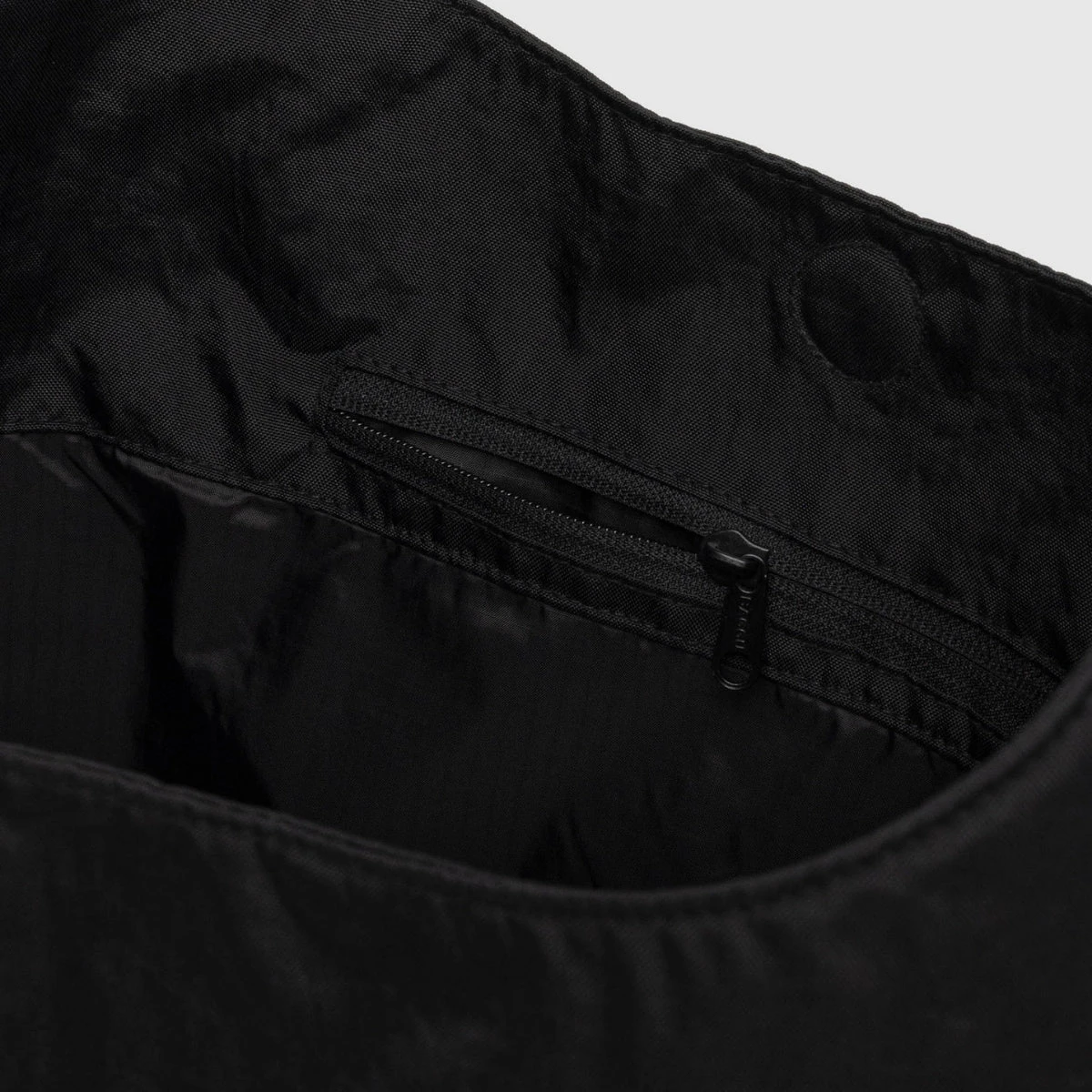 A slouchy, softly structured nylon bag with an adjustable strap. Interior zip pocket with a magnetic closure.