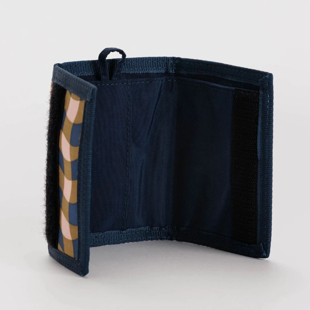 - A trifold wallet with four card pockets, one bill fold, velcro closure