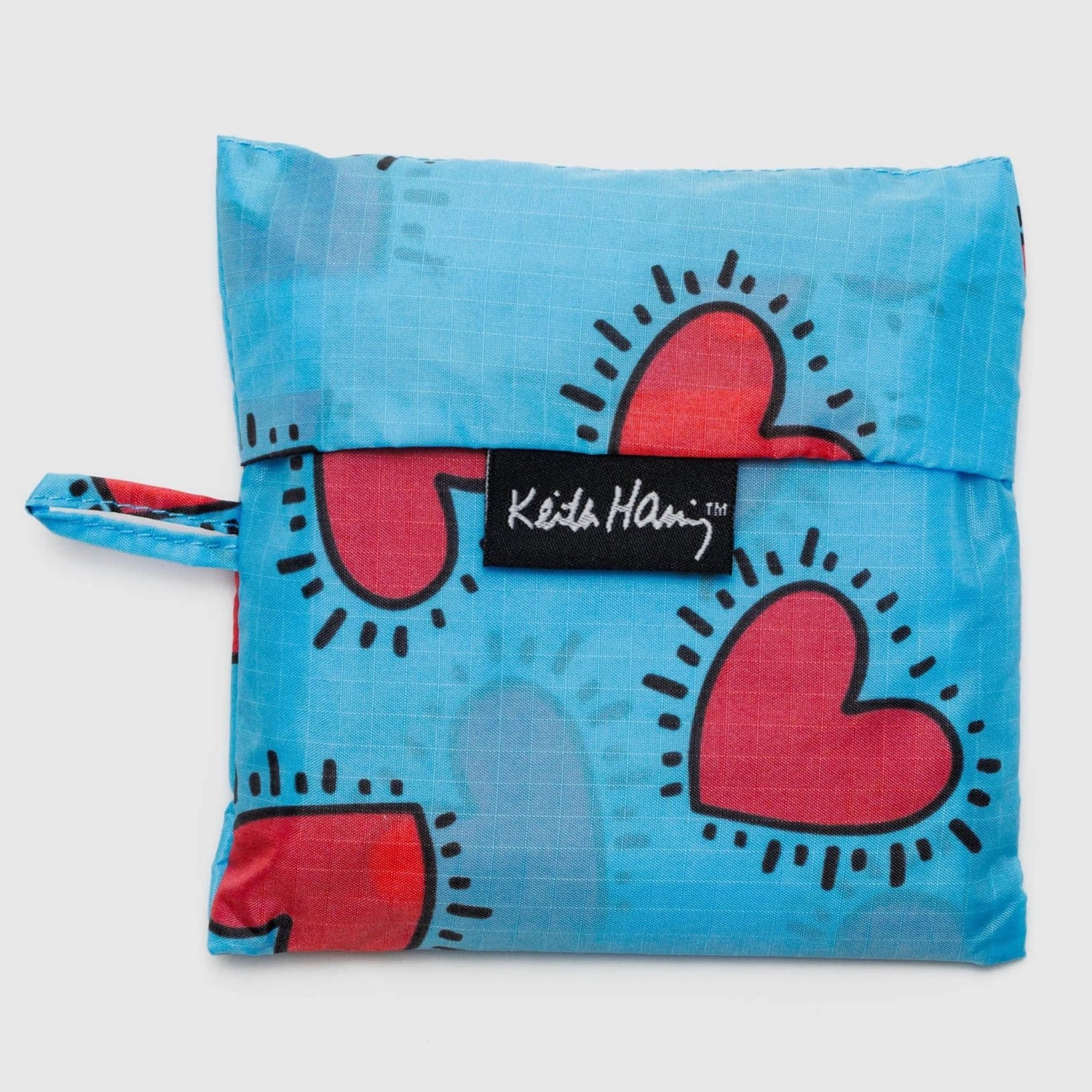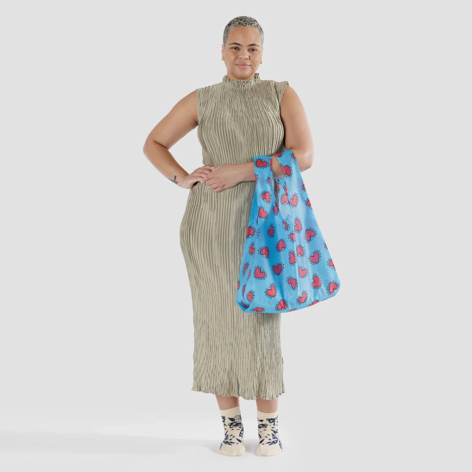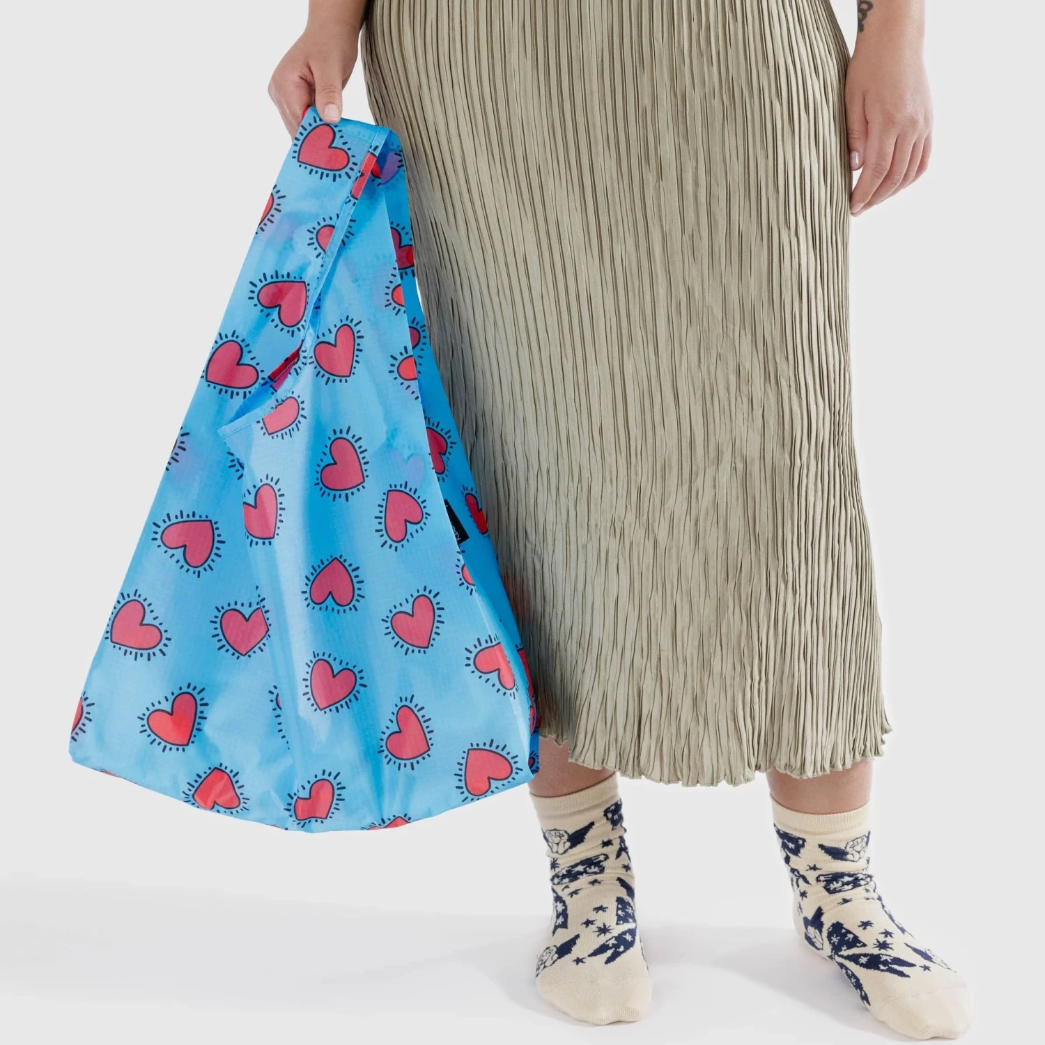 The best-selling Standard Baggu Keith Haring Hearts isn’t just for groceries—it’s your all-purpose bag for almost anything, anywhere. Carry it by hand or over your shoulder. It holds 2 to 3 times more than a plastic grocery bag and is made from 40% recycled nylon.