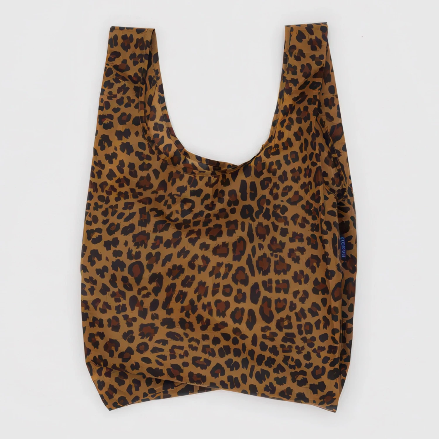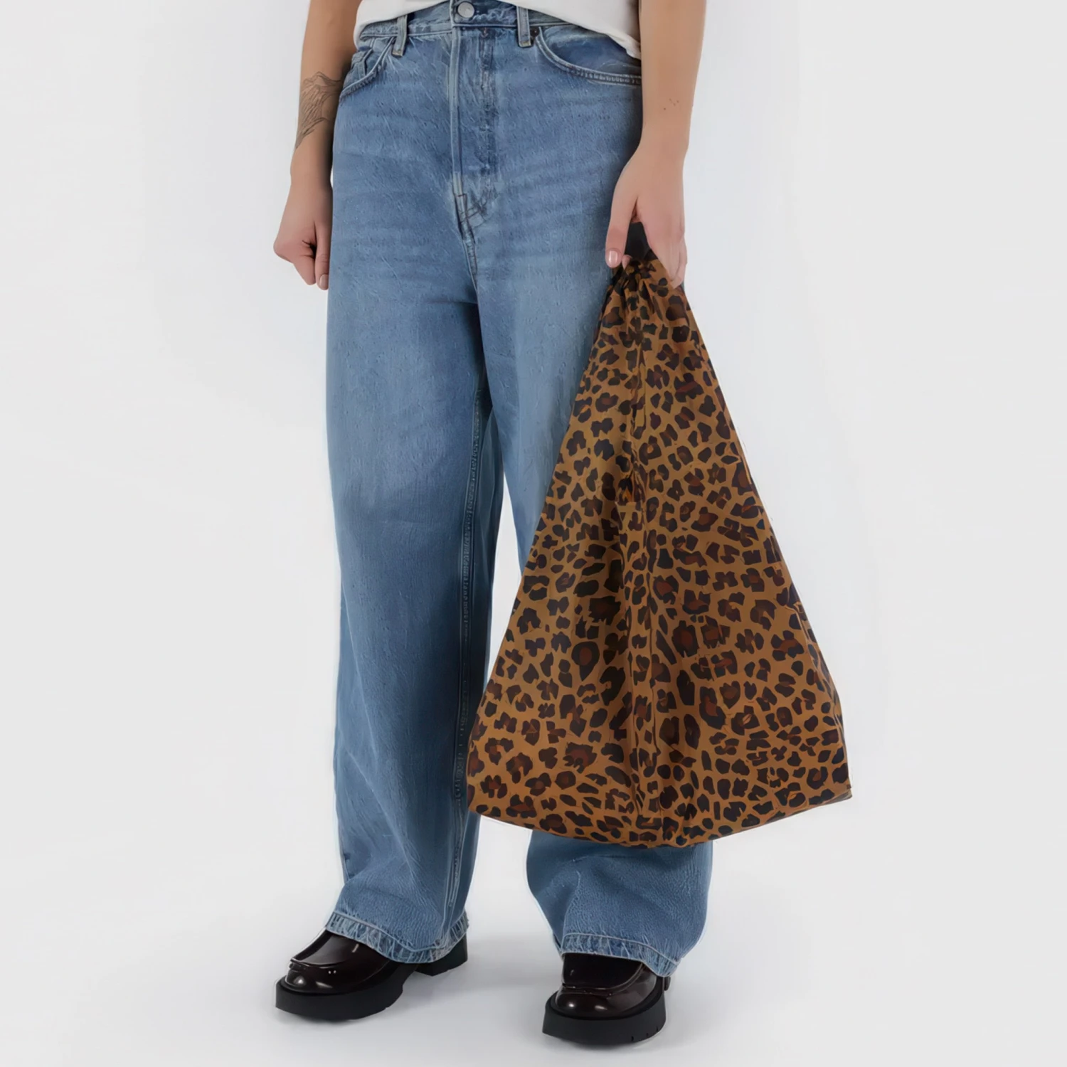 Baggu Leopard tote hauls up to 50 lbs, folds into a pouch, and brings wild style to grocery runs, errands, and everyday adventures.